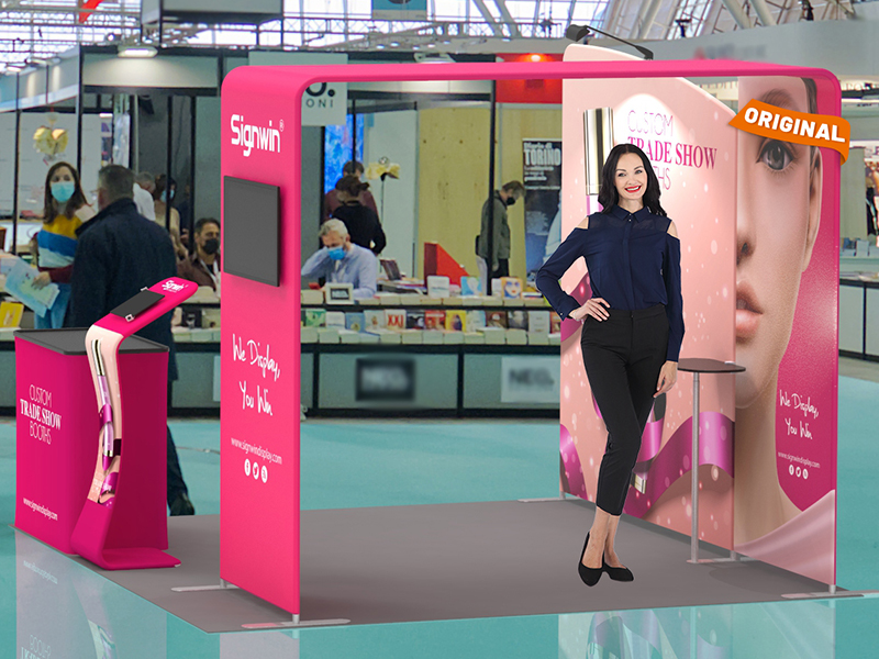 Multiple tension fabric backwall displays with superior quality fabric material can be custom printed with your business logo using heat transfer printing.The tension fabric backwall display is meticulously to match the background. This allows you to set up your own special trade show exhibits. The eye-catching structure is designed around a base aluminum frame and comes with a plastic case for easy dismantling and transportation. The whole backwall displays provide an elegant effect to your images, making it ideal for all your customized tradeshow booth ideas.
