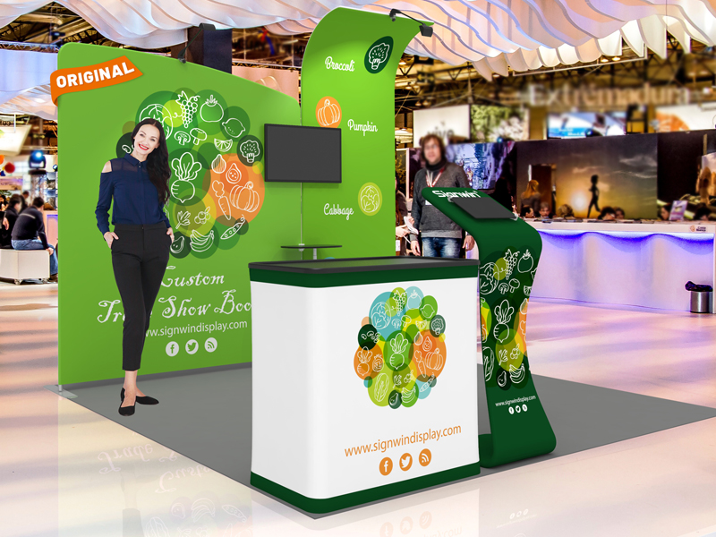 Multiple tension fabric backwall displays with superior quality fabric material can be custom printed with your business logo using heat transfer printing.The tension fabric backwall display is meticulously to match the background. This allows you to set up your own special trade show exhibits. The eye-catching structure is designed around a base aluminum frame and comes with a plastic case for easy dismantling and transportation. The whole backwall displays provide an elegant effect to your images, making it ideal for all your customized tradeshow booth ideas.