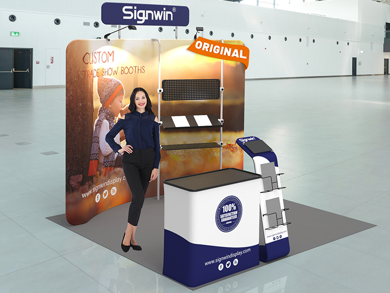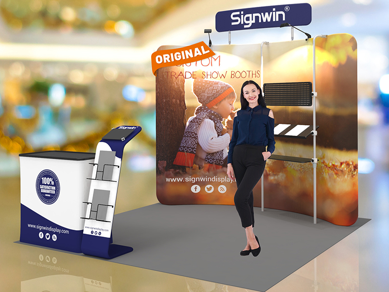 Multiple tension fabric backwall displays with superior quality fabric material can be custom printed with your business logo using heat transfer printing.The tension fabric backwall display is meticulously to match the background. This allows you to set up your own special trade show exhibits. The eye-catching structure is designed around a base aluminum frame and comes with a plastic case for easy dismantling and transportation. The whole backwall displays provide an elegant effect to your images, making it ideal for all your customized tradeshow booth ideas.