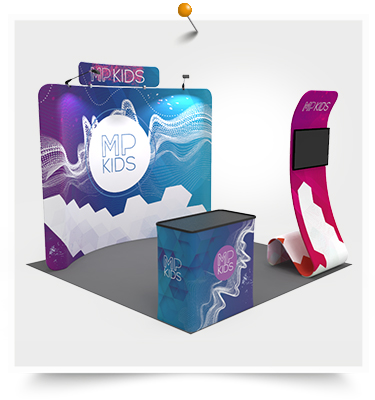Our 10x10 booth combo packages include everything you need to create a successful trade show experience, including a Custom 10ft Curved & Collapsible Tension Fabric Trade Show Backwall Display, a Custom W58in x H12in Curved Tension Fabric Header, a Custom Highboy Bar Height Cocktail Table with Graphic Cover for Trade Shows, a Hard Case to Podium with Custom Printed Graphic, two Trade Show Display LED Lights & Clips.