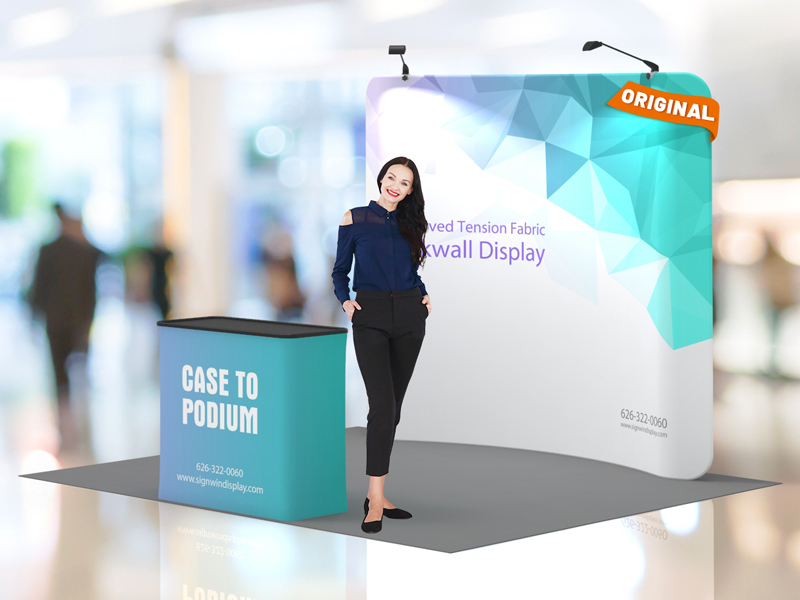 Custom 8ft Curved & Eye-Catching Tension Fabric Trade Show Booth Backwall Display with Durable Case to Podium