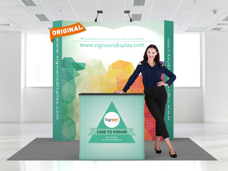 Custom 8ft Curved & Velcro Fabric Pop Up Trade Show Booth Backwall Display with Premium Case to Podium