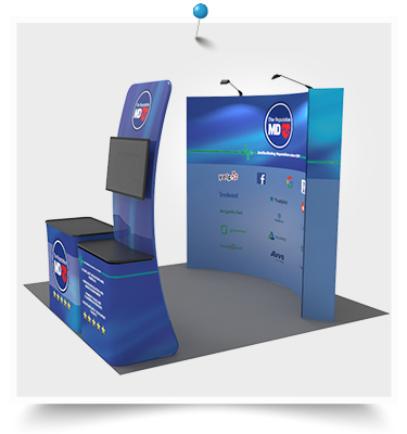 Our 10x10 booth combo packages include everything you need to create a successful trade show experience, including a Custom 10ft Curved & Strong Fabric Pop Up Trade Show Backwall Display, a Hard Case to Podium with Custom Printed Graphic, a Monitor Display Table Banner Stand, two Trade Show Display LED Lights & Clips.