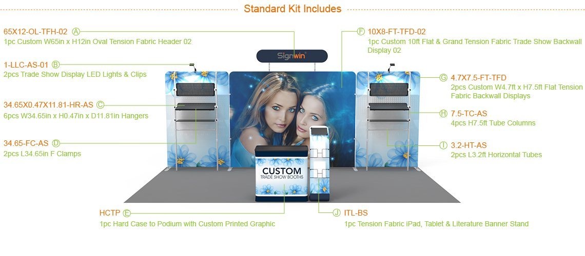 No matter if you attend but one exhibit or a full schedule of events each year, Signwin can provide you with the trade show booths and promotional graphics to get your brand noticed. Our experienced design consultants can transform your vision into a booth or display that’s attractive, functional and affordable. While exhibiting, you’ll gain an opportunity to make a positive first impression. Better yet, it’s a great chance to garner future sales leads as well as sign immediate deals! Therefore, here comes the 10x20ft custom trade show booth 18, which is composed of: 2pcs trade show display LED lights & clips, 1pc custom w65" x h12" flat tension fabric header, 2pcs l3.2ft horizontal tubes, 6pcs w34.65" x h0.47" x d11.81" hangers, 4pcs h8ft tube columns, 2pcs custom w4.7ft x h7.5ft flat tension fabric backwall displays, 1pc 10ft flat & durable tension fabric backwall display, 1pc tension fabric iPad, tablet & literature banner stand and 1pc hard case to podium with custom printed graphic.