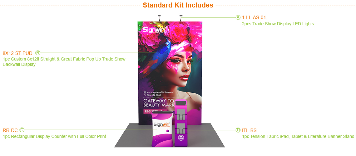 Our 10x10 booth combo packages include everything you need to create a successful trade show experience, including a Custom 8x12ft Straight & Great Fabric Pop Up Trade Show Backwall Display, a Rectangular Display Counter with Full Color Print, a Tension Fabric iPad,Tablet & Literature Banner Stand, two Trade Show Display LED Lights & Clips.