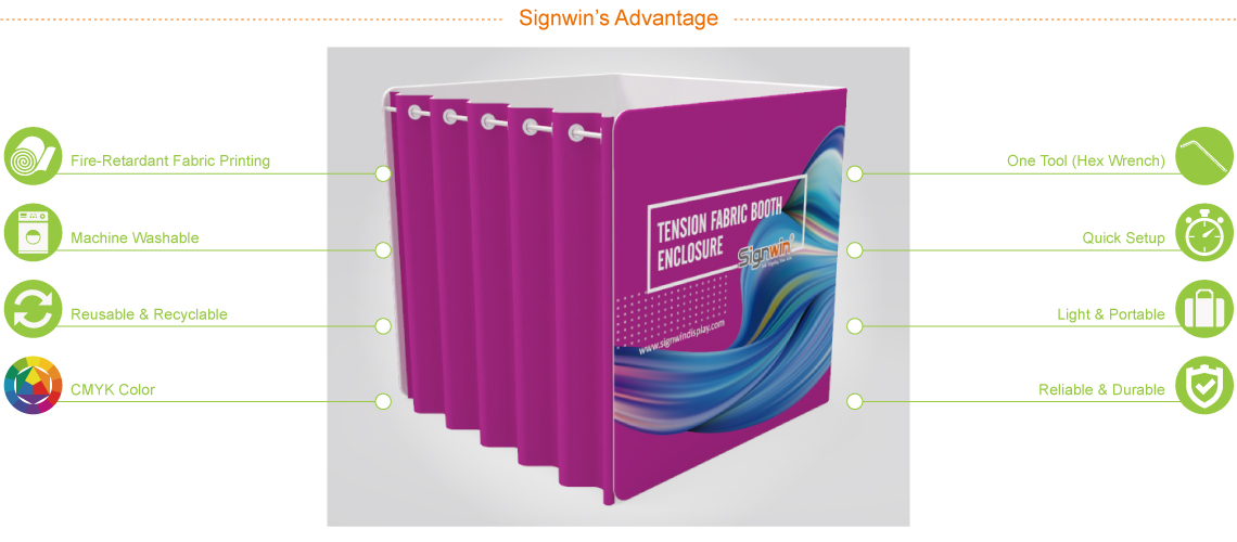 We utilize 100% polyester straight grain fabric.The frame is made from durable, lightweight aluminum tubing that is bungee-corded together for easy set-up. It is provided a privacy space for business discussion during trade show, also different kinds of parties as well. Any size or shape can be customized per requests.