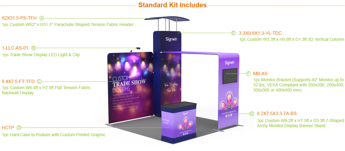 Customize a 10x10ft trade show booth combo for any events to grab attention, entices and engages audience and build your brand awareness at Signwin. This two panel combo offers two different tension fabric backwall displays with multiple Lumina LEDs, a carrying hard case to podium with custom printed graphic, a ipad banner stand, a simple stand with shelf.